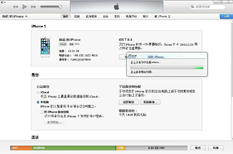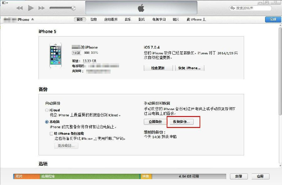 1.將iOS設備連接電腦,打開iTunes。點擊恢復備份即可