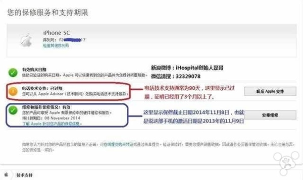 2:直接https://selfsolve.apple.com/agreementWarrantyDynamic.do?官網查詢電話技術支持日期與保修截止日期。或直接撥打蘋果官方服務熱線400-627-2273.如果是全新未激活的,從你激活之日起,這個就可以算得出來。如果是官翻後封的,最起碼也要有個300多天的保修。如下圖: