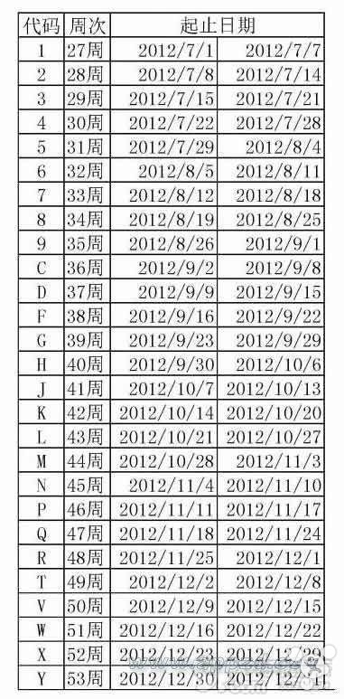 5.第五位是說明生產周,用9個數字(1-9,除去0)和字母(26個字母中除去A,B,E,I,O,U,S,Z)來表示的,共27個,由於上一位字母已經說明是上半年或下半年,所以這裡僅需要27個字符來表示,比如本例序列號的值是J,則說明是第15周,再結合上一位G的含義是2011年下半年,則說明生產日期是27 15 = 第42周,也就是2011年10月10日 – 2011年10月16日之間,對應表如下圖: