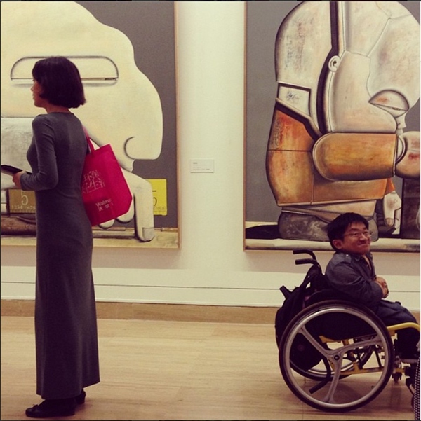 坐在輪椅上的男子和背對著他亭亭玉立的女子,及牆壁上的畫形成對比。
