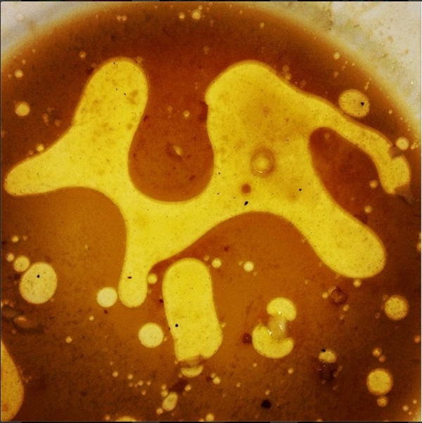 這張牛頭馬面,其實是火鍋湯斷火後形成的油膜反光。