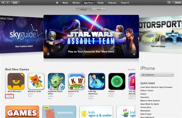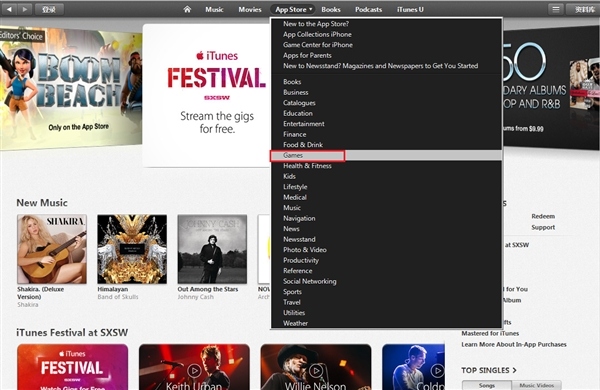 第二步:找到免費注冊入口。進入對應下載區(如新西蘭區)後,找到如下圖中的App Store下拉按鈕,點擊翻開並找到Game選項,切換到游戲列表。