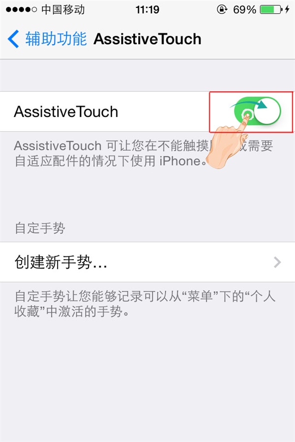 最後,在“AssistiveTouch”功能頁面,向右滑動功能開關按鈕,即可開啟該功能。這時,虛擬按鍵(即小圓點)就顯示在iPhone屏幕右下方。