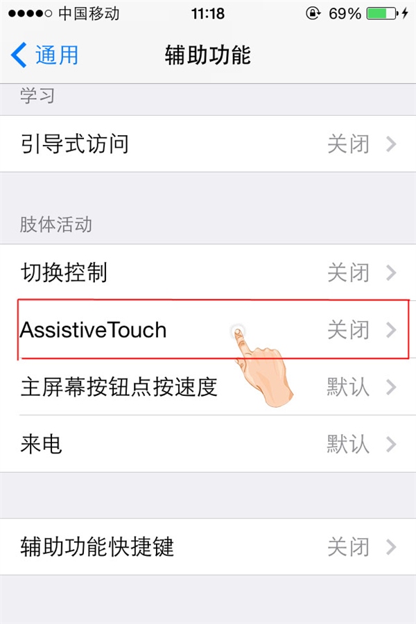 其次,在“通用”選項界面,=進入“輔助功能”界面,找到“肢體活動”分欄目中的“AssistiveTouch”功能。