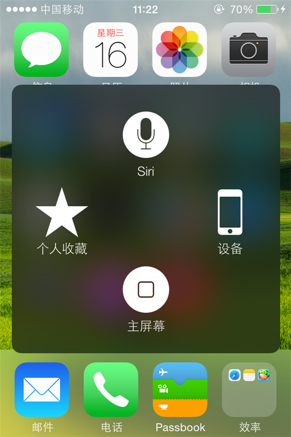 回到屏幕主界面,點擊虛擬按鍵圓點,就看到Siri、設備、主屏幕等相關的虛擬按鍵,點擊需要使用的按鍵,即可使用了。