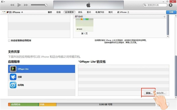 首先,打開iTunes,進入iPhone中“應用程序”頁面,在該頁面下方,點擊應用程序“OPlayer Lite”,然後在其右側點擊“添加”。