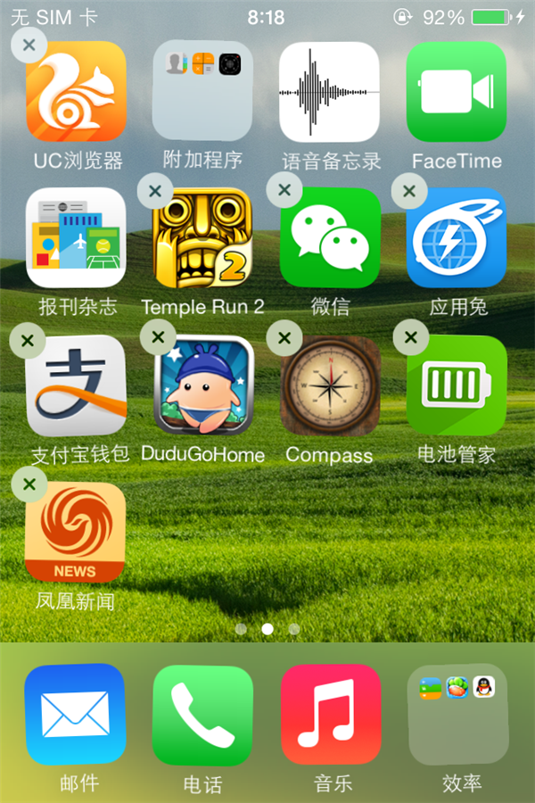 首先,在主界面中,用手指按住某個應用圖標片刻,屏幕中所有的應用圖標就會晃動,有些圖標會顯示刪除標記。