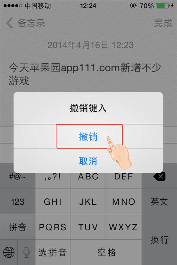 比如用戶在備忘錄中已經輸入一些內容,要把這些內容全部刪除時,只要晃動手機幾下,就會出現“撤銷鍵入”的窗口,點擊“撤銷”就可實現快速刪除。