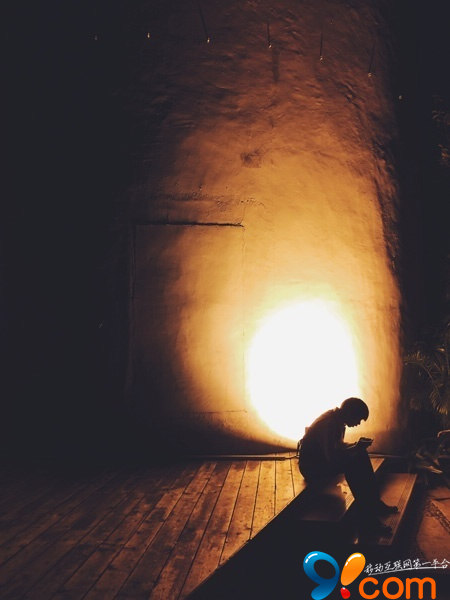 坐在路邊的人。背後有一盞地燈,仿佛燭光中的人影。