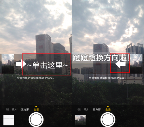 因為個人習慣,或者拍攝對象和條件的限制,默認向右的拍攝方向並不那麼方便。按下拍攝按鈕前點擊半透明帶的任意區域,就可以切換這個方向,也就是變成向左拍攝了。