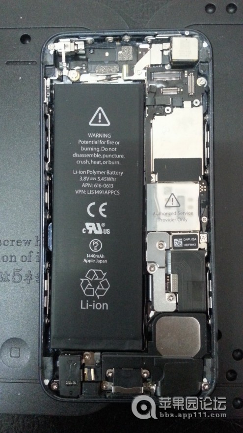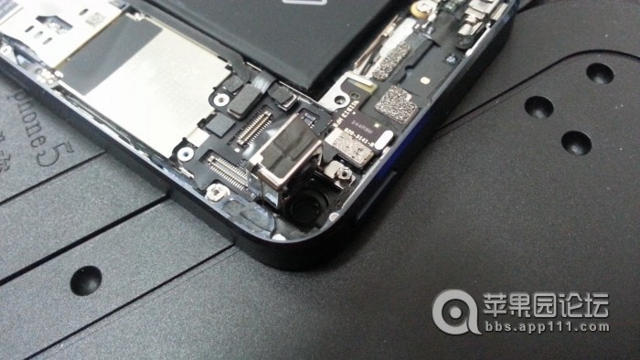 iPhone5的拆解很容易,網上也有現成的教程。下面是拆下前面的液晶屏之後的樣子。右上角四四方方的就是主攝像頭!