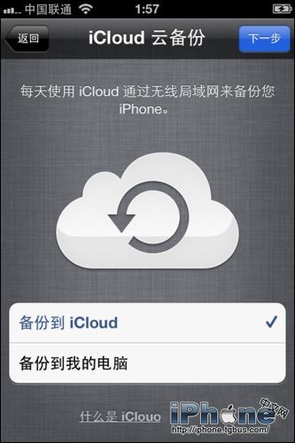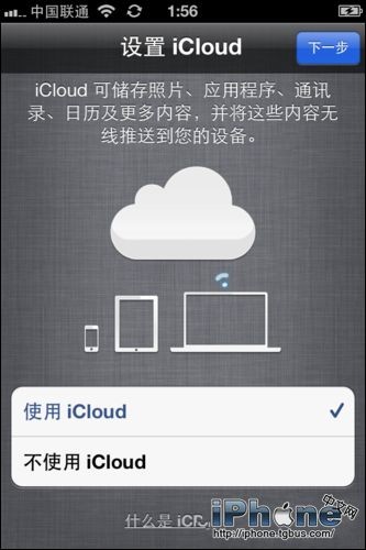 7、登陸成功,進入icloud設置界面,選擇使用icloud。icloud就是我們說的雲備份,icloud可將照片、音樂、通訊錄、應用程序等在手機上進行備份,無需使用PC;