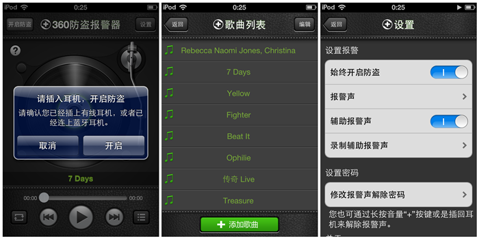 算的上是音樂防盜類最火的一款應用,沾了不少360的光。界面做的比較干淨,作為免費應用居然找不到廣告讓人很是歡喜。作為播放器能讀取本地的音樂文件,但無法導入已有的播放列表。插上耳機或者連上藍牙耳機開啟防盜模式後,只要耳機被拔掉就能最大音量的發出警報,輸入密碼後才能取消報警。
