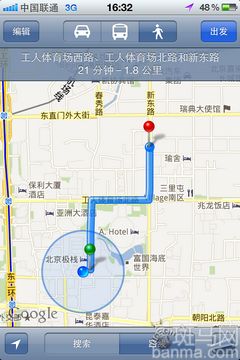 點擊之後,我們可以很快的了解到餐吧相關的美食信息,和具體的位置。點擊右上角的“地圖”按鈕,紅色大頭針所在的位置就是餐廳所在位置,再次點擊右上角的“查看路線”按鈕。可以獲取到一個你所在地點到餐廳的最佳路線!哇塞!原來離我如此之近,看來真是天意啊!(注意一定要開啟手機的“定位服務”)