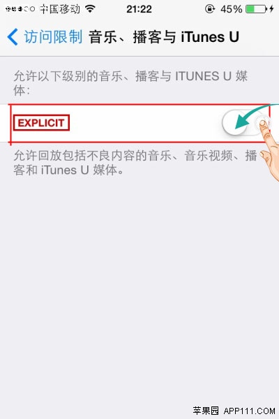 第五步,在“音樂、播客與iTunes U”選項頁面,關閉“EXPLICIT”功能,即可隱藏指定的音頻文件。