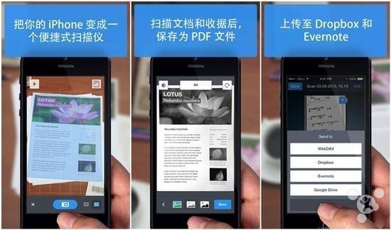 Scanner Pro是一款老牌的手機文檔掃描應用,界面直觀操作簡單,可以將拍攝的文件保存為PDF或是JPG格式。它的掃描效果快而清晰,文字的優化效果很出色,同時還可以將文檔上傳至印象筆記、drop box等服務中。另外,你也可以自定義排序文檔,直接將它們打印出來或是發送電子傳真。