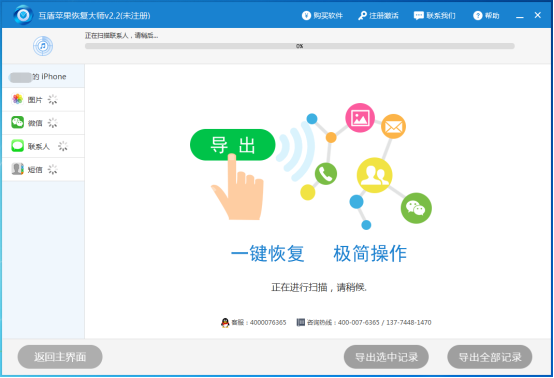 4、接下來就進行蘋果手機怎麼恢復刪除的短信重要的一步,點擊開始掃描後,一般軟件掃描時間大約在5-30秒之間,當然這個也需要取決文件的多少以及大小。但是要提醒各位的是軟件在掃描期間大家不要終止。以防止手機短信掃描不完整。