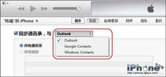 3、iTunes同步“通訊錄”支持多渠道數據,同步的來源支持Outlook、Google contacts及Windows contacts。