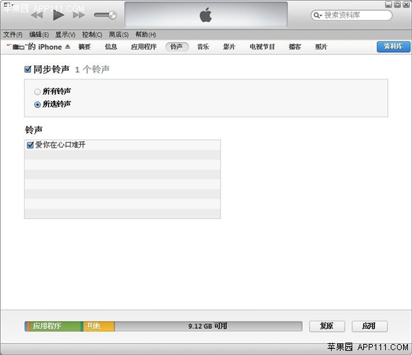 第八步,將iPhone與電腦相連,選擇iPhone管理頁面的“鈴聲”選項卡,選擇剛剛制作的鈴聲,點擊“應用”進行同步,即可將該鈴聲同步到iPhone上。