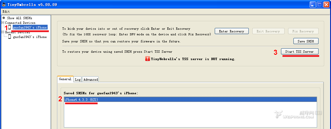 3)Start TSS Server前,是否選中了你的iPhone(注意是Connected Devices,而非Recent Devices)以及你想要恢復的.shsh基帶?