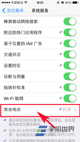 3)在“系統服務”界面就能看到“常去地點”功能了,點擊進入後對“常去地點”欄的功能按鈕進行關閉即可。