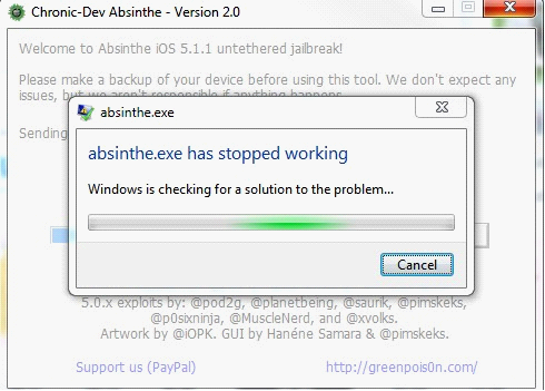 6、根據設備的不同,這個過程也不一樣。剛剛刷過的機器,這個過程很快,而如果你的機子裡有很多程序文件,那麼這個過程將會很漫長。靜待進度條走完,一定要耐心哦。如果你的設備需要備份的東西太多,Absinthe2.0可能會奔潰...如下圖。出現這種情況,建議將設備更新到iOS5.1.1,先不要還原數據,然後再重新越獄。