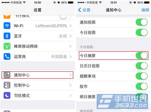 3)回到【設置】頁面,選擇【通知中心】,打開【今日摘要】選項。