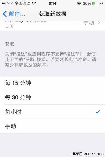 第三步,在“獲取新數據”頁面,點擊開啟“推送”功能,還可以設置每15分鐘、30分鐘或一個小時讓iPhone檢查一次新郵件。