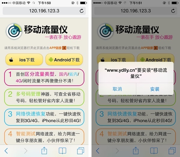 刷新iOS8之後,下載上次破解4G網絡時的“移動流量儀”。