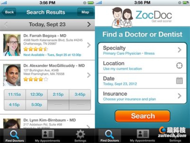 現在大型公司經常會遇到這樣的麻煩,預約醫生。現在蘋果推出了一款新的應用程序,蘋果的iOS與ZocDoc連接在一起,讓你給醫生打電話變得更容易。ZocDoc有著衛生系統中最好的數據庫,它把透明和效率帶到了這一行業中,使得一直以來讓人們頭疼的問題得到解決,並且這是免費的。