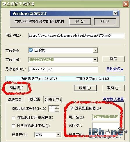 用右鍵點然後復制地址,打開迅雷以後新建下載任務,點高級,在登陸服務器那裡填寫用戶名iTunes/7.5 (Windows; N),這個非常重要哦,因為你直接下載的話會被蘋果發現的,根本下載不了,還有如果你的版本不是7.5就用戶名填寫你自己的版本號,例如你是7.43 就填 iTunes/7.43 (Windows; N)