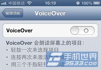 3)然後在“輔助功能”中輕按一次來選中的“VoiceOver”,再按二次進入開關切換選項