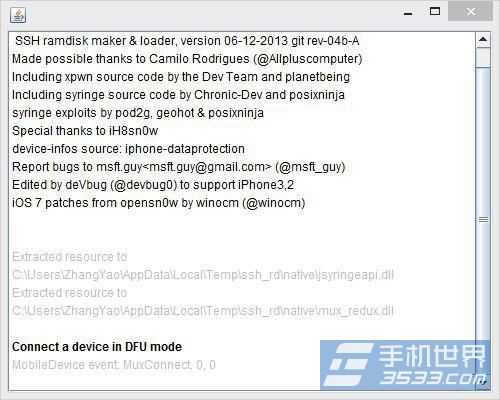 手機需要重啟,或者沒電關機後,開機是要通過引導的。引導方法,按越獄工具上的橫排按鈕,進入DFU,等待手機走代碼然後重啟,重啟之後還會注銷一次。