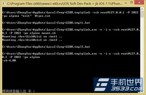 如果沒有自動走完(我越獄時沒有提示輸入)而是提示你輸入,這裡先要輸入“Y”,然後會提示讓你輸入username,鍵入“root”,之後會要求輸入密碼,直接按回車,會提示錯誤。這時不要理會,繼續按回車,按5次後,就會進入越獄數據上傳階段,然後就等待即可。自動完成後,窗口1,2,3會自動關閉。