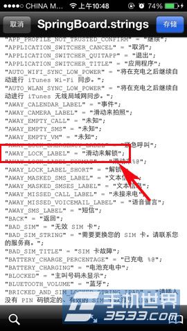 2)依次打開“System/Library/CoreServices/SpringBoard。app/zh_CN。lproj”文件夾,最後點擊“zh_CN。Lproj”文件進行編輯,找到"AWAY_LOCK_LABEL"修改後面的“滑動來解鎖”文字。