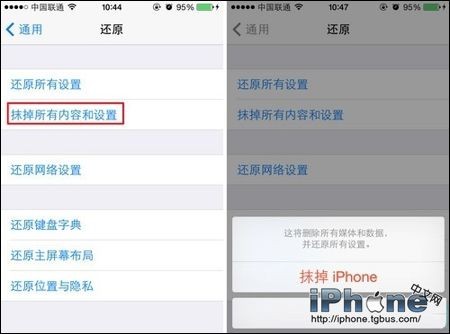 3、“還原”選項中,我們選擇“抹掉所有內容和設置”。按照提示“將刪除所有媒體和書籍,並還原所有設置”,我們再點擊“抹掉iPhone”。