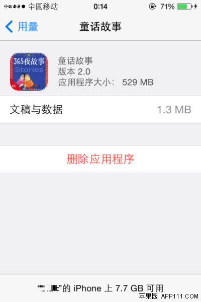 第二步,點擊不需要的應用,即可進入該應用詳細用量頁面。點擊“刪除應用程序”即可快速刪除,獲得較多空間。