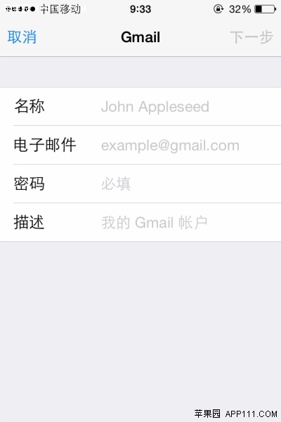 4、在Gmail頁面,填入名稱、電子郵件、密碼後,點擊“下一步”即可成功添加。