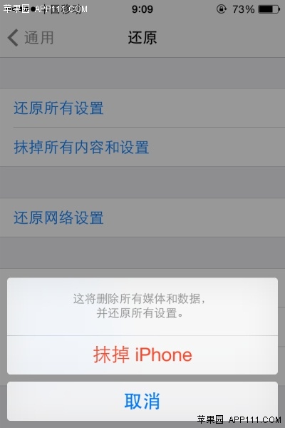 第四步:接著,會提示“將刪除所有媒體和數據”,點擊“抹掉iPhone”,即可讓iPhone干干淨淨,恢復到出廠狀態。