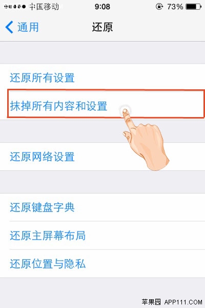 第三步:在“還原”選項頁面,點擊“抹掉所有內容和設置”。