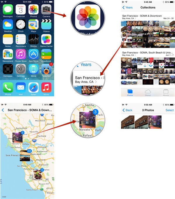 有了這些智能分組,用戶就可以快速浏覽拍攝照片或視頻的時間和地點,通過縮略圖查找照片或視頻,同時還能以地圖的形式將用戶在全世界拍攝的照片標識出來,甚至可以將照片復制到剪貼板,以便快速插入到消息中。這一切只需用戶滑動或點擊屏幕即可搞定。