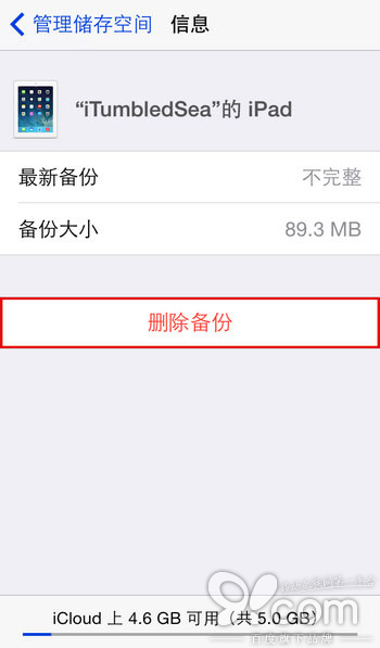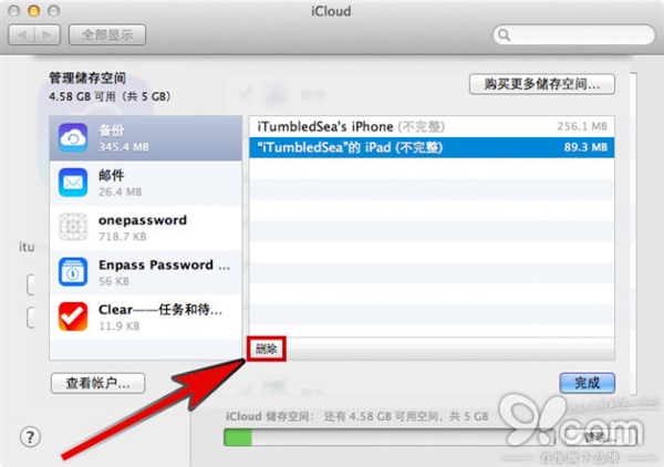 第五步:點擊「刪除」按鈕(如圖)。iCloud 設置面板將在上方彈出確認刪除面板,點擊「刪除」來確認刪除這一備份文件。
