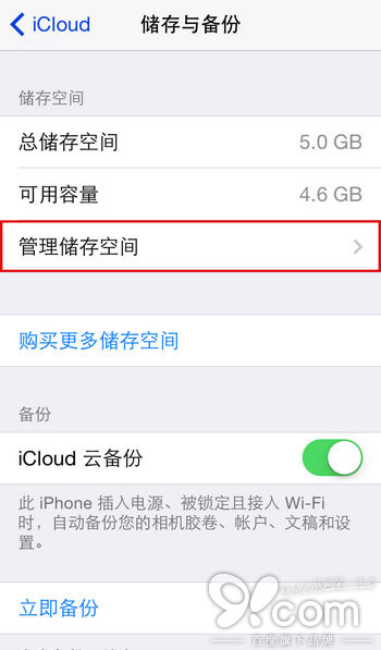 第三步:在「存儲與備份」界面選擇「管理存儲空間」選項。此時你會看到你所有的 iCloud 備份列表,選擇需要刪除的那個備份文件,點擊它來查看該備份詳情。