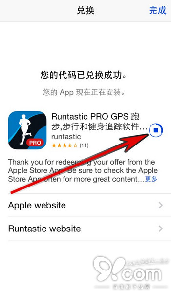 稍等片刻,即可看見「您的代碼已兌換成功」提示頁面。同時你還可以看見應用程序的安裝進度(如圖)。點擊頁面右上角的「完成」按鈕即可返回至 App Store。