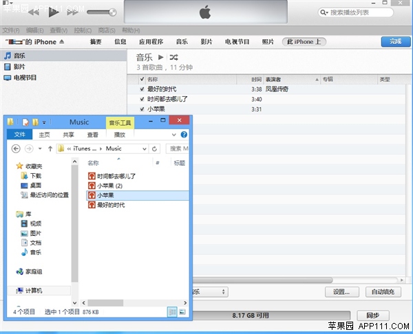 第三步,選擇需要添加的音樂,直接拖拽至iTunes上已經連接好的iPhone設備即可。