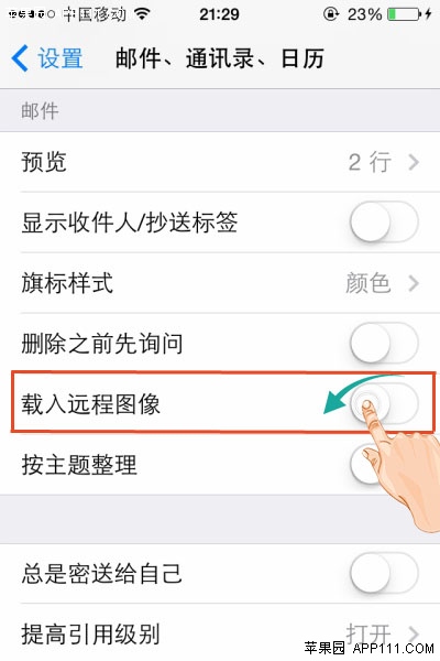 第二步,在“郵件、通訊錄、日歷”選項頁面,關閉“載入遠程圖像”功能,即可。