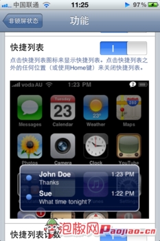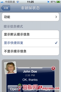大家應該都有看過iOS 5的通知系統,讓大家都為之驚歎,但是大家又知不知道,這個系統在很早就有了,因為在cydia中出現,所以大家認識不多。但是可以側面從iOS 5的系統反觀biteSMS的通知系統,就知道這個功能的強大,我們可以顯示聯系人的頭像,可以快速回復、關閉、查看等操作,完全可以不用劃開滑蓋。