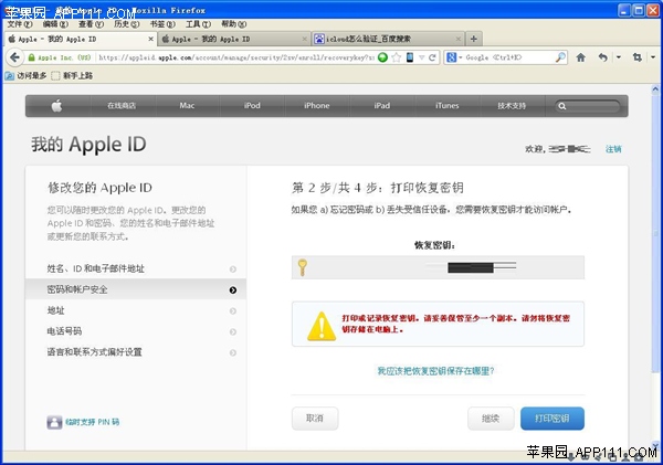 第四步,在設置兩步驗證時,需要添加手機號碼設置受信任設備、打印恢復密鑰、確認恢復密鑰等幾個步驟。