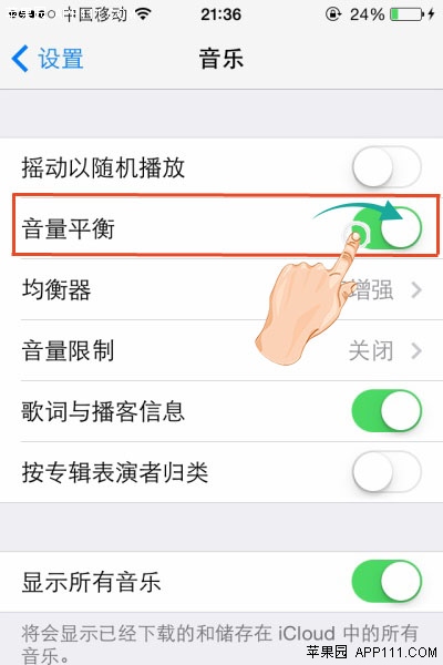 第二步,在音樂選項頁面,開啟“音樂平衡”功能即可。因為“音量平衡”可以自動偵測所有歌曲的音量,然後調查至大約差不多的水平。