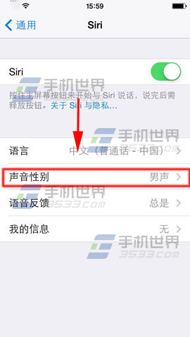 2)在【Siri】選項頁下,點擊【聲音性別】,在這裡我們就可以設置Siri的聲音性別了。